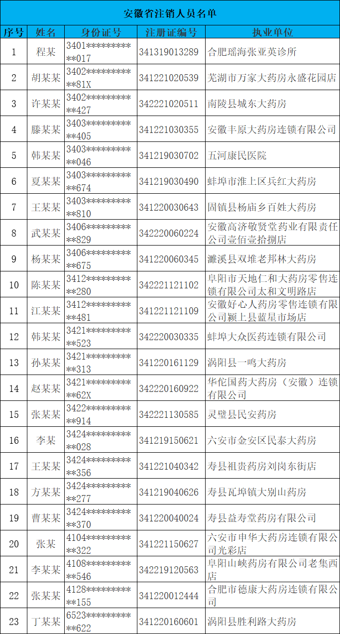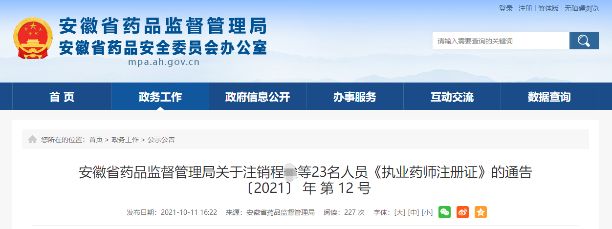 10月11日,安徽省药监局发布了“关于注销程俊等23名人员《执业药师注册证》的通告(〔2021〕 年 第 12 号)”(以下简称“通告”)。