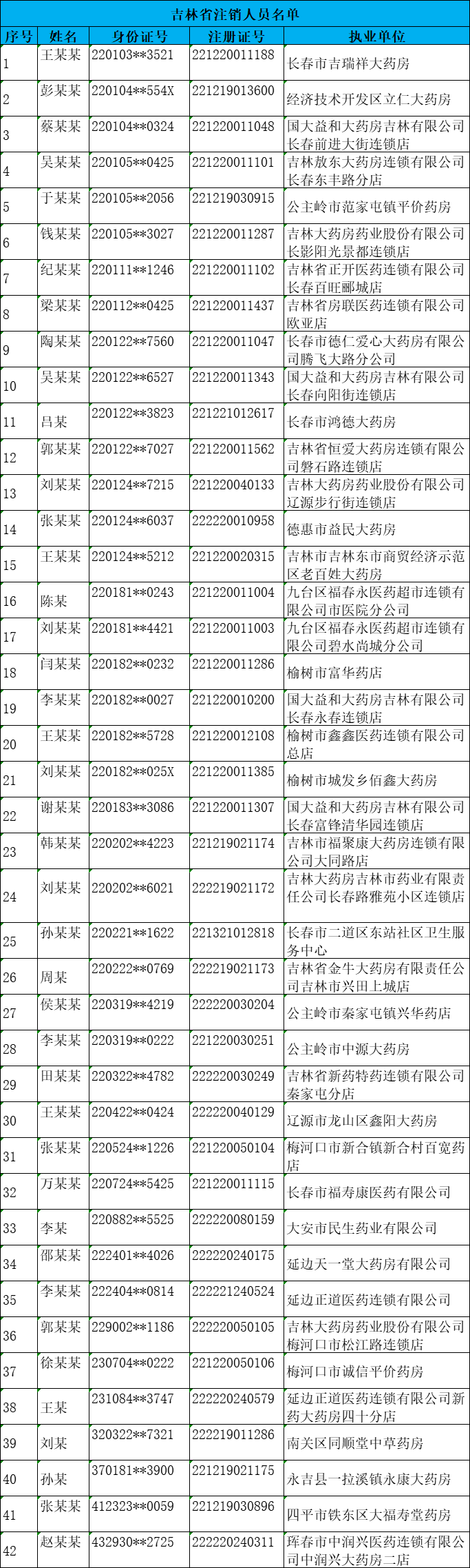吉林省明确,根据《执业药师注册管理办法》、《关于印发<人力资源社会保障系统开展证明事项告知承诺制试点工作实施方案>的通知》有关要求,注销王某某等42人《执业药师注册证》。