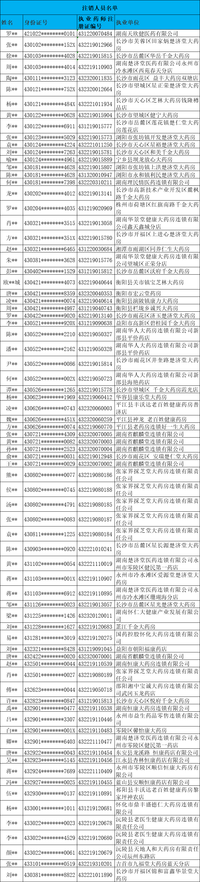 无偶有偶,早在9月24日,湖南省药监局也发布类似的通知,根据《国家药监局执业药师中心关于核实并处理执业药师注册相关信息的函》,该局在中国人事考试网上未查询到罗某某等77名人员执业药师职业资格信息。