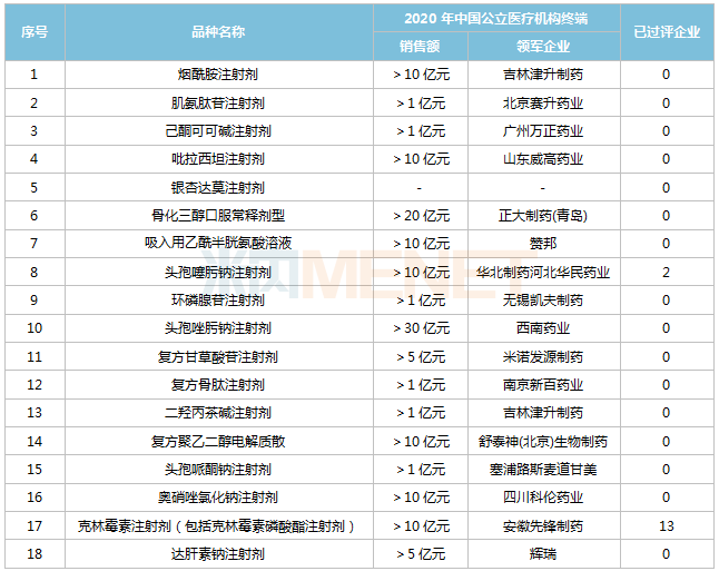 18个药品在2020年中国城市公立医院、县级公立医院、城市社区中心以及乡镇卫生院(简称中国公立医疗机构)终端合计销售额近200亿元,烟酰胺注射剂、吡拉西坦注射剂、骨化三醇口服常释剂型、吸入用乙酰半胱氨酸溶液、头孢噻肟钠注射剂、头孢唑肟钠注射剂、复方聚乙二醇电解质散、奥硝唑氯化钠注射剂、克林霉素注射剂(包括克林霉素磷酸酯注射剂)均超10亿元。
