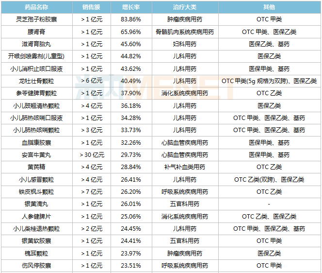 从增长率看,11个中成药大涨超30%,其中儿科用药占“半壁江山”;灵芝孢子粉胶囊增速最快,超过80%。