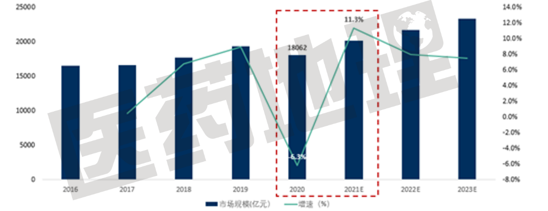图1.2016-2023E中国药品终端市场规模(单位:亿元)及增速