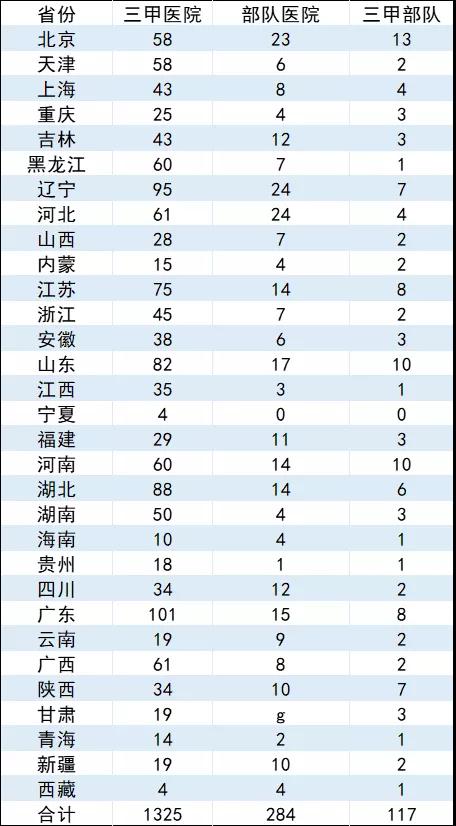 立鼎产业研究网公布的《2018年各省三甲医院、部队医院、三甲部队医院数量》就显示,全国1325家三甲医院,部队医院284家,部队三甲医院117家。