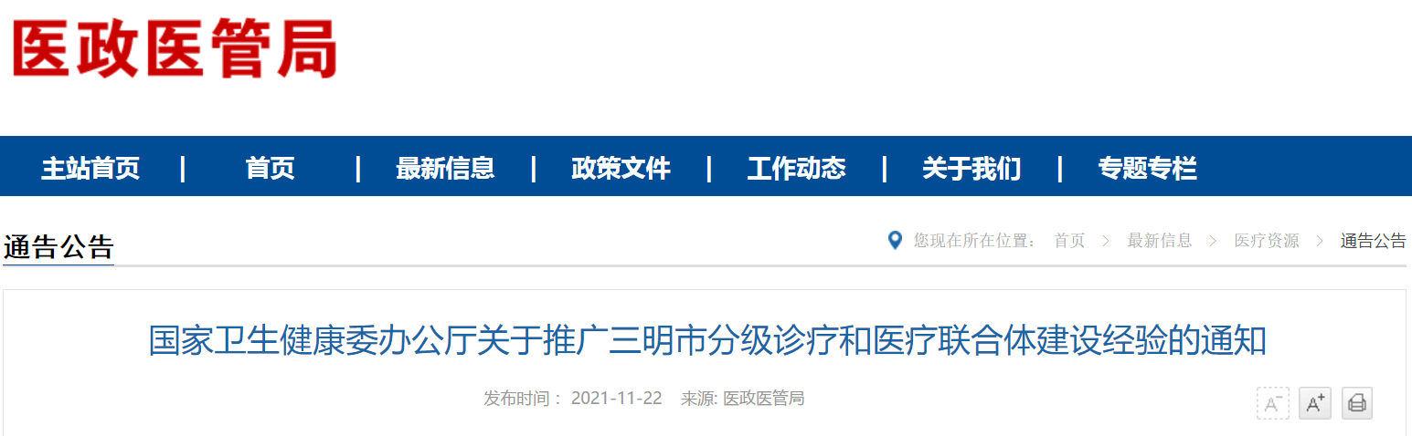 11月22日,国家卫健委办公厅发布关于推广三明市分级诊疗和医疗联合体建设经验的通知,内容涉及7大经验、8项任务和组织实施。