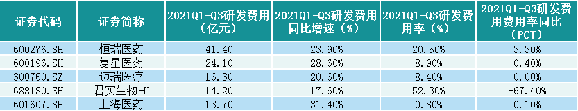 表3:2021 年前三季度 SW 医药生物板块研发费用前五大上市公司