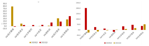表2:医药板块2020Q3和2021Q3业绩和归母净利润增速情况