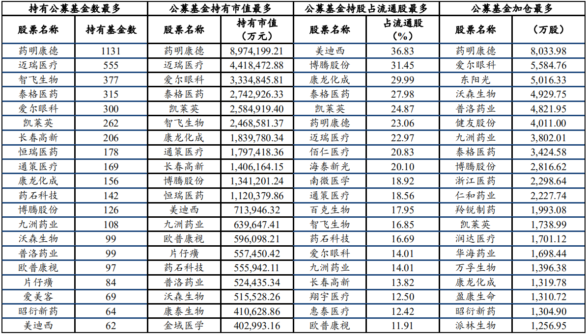 持有基金数最多的前十名品种为:药明康德、迈瑞医疗、智飞生物、泰格医药、爱尔眼科、凯莱英、长春高新、恒瑞医药、通策医疗、康龙化成。