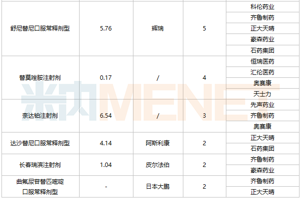 上述品种中,目前过评最多的是阿法替尼口服常释剂型,原研厂家为勃林格殷格翰,已经过评的企业包括:石药、科伦、豪森、齐鲁、山香、扬子江、正大天晴。作为多家知名药企纷纷过评的重磅药物,米内网数据显示,阿法替尼口服常释剂型2020年中国公立医疗机构终端销售额已经达到4.35亿元。