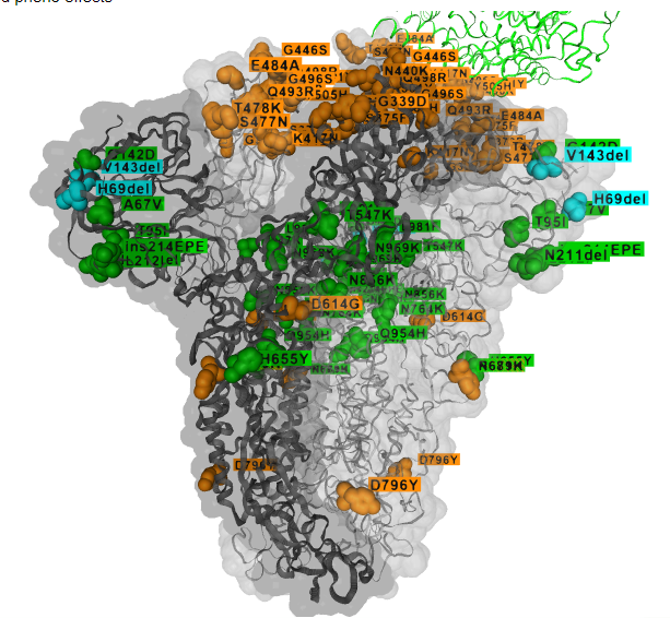 ▲Omicron在新冠病毒刺突蛋白上携带的变异(图片来源:gisaid.org)