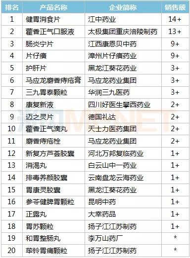随着更多的中药新药上市,不仅可能挑战传统独家品种的市场地位,甚至带来中医药企业新一轮洗牌。米内网数据显示,2020年中国城市实体药店终端消化系统中成药销售额突破140亿元,预计2021年将再创新高。产品Top 20中,有11个是独家产品;健胃消食片和藿香正气口服液销售额均超过10亿元,肠炎宁片和片仔癀有望跻身10亿级产品之列。品牌Top 20中,有18个销售额超过1亿元,江中药业的健胃消食片、太极集团重庆涪陵制药的藿香正气口服液、江西康恩贝中药的肠炎宁片位居前三。2021年申报的中药新药中,江京新药业的康复新肠溶胶囊、扬子江清肠温中片等就属于消化系统治疗领域。