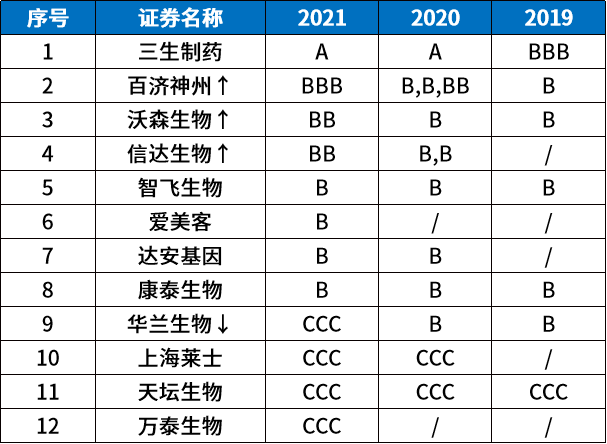 A级与BBB级企业数量跃升,分别占比为18.0%和23.0%,如云南白药从BBB级提升为A级,则从2020年的BB级连升两级至A级;相应的BB与B级的企业占比有所下降,分别为24.6%与23.0%。