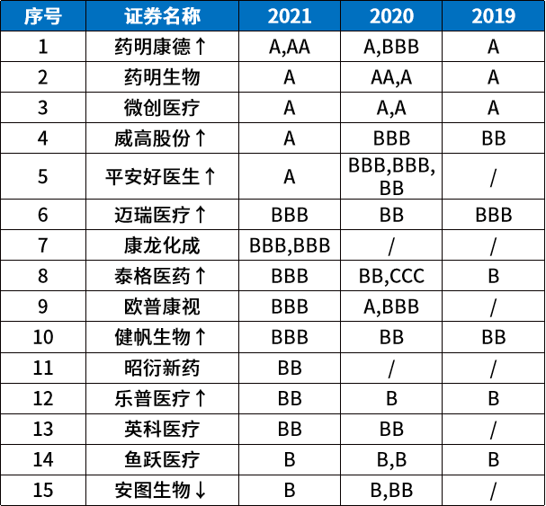 2021年中国医药行业2家迈入AA领先等级,A级与BBB级企业数显著提升。已有2家医药行业上市公司进入全球领先等级,为AA级,如药明康德;