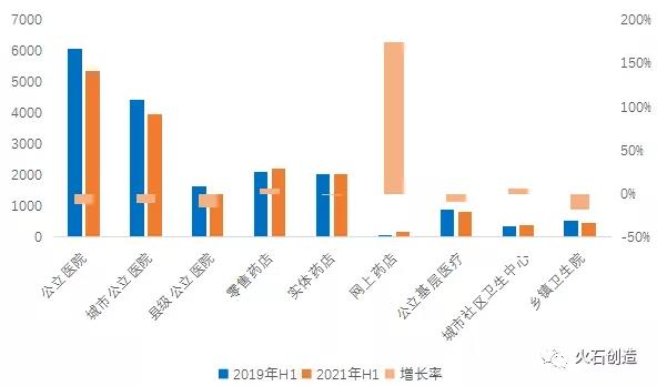 从六大市场的销售额分布来看,市场结构变化较大。公立医院终端中,2021年上半年城市公立医院药品销售额同比增长12.6%,增速比县级公立医院高7个百分点;零售药店终端中,2021年上半年网上零售药店药品销售额同比增长60.9%,增速比实体零售药店高57.9个百分点;基层医疗终端中,2021年上半年城市社区卫生中心药品销售额同比增长4.9%,增速比乡镇卫生院高1.4个百分点。