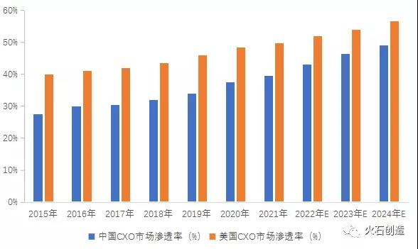 国内CXO渗透率不断提升,但相对美国市场,仍有较大提升空间。2021年我国CXO市场渗透率有望接近40%,与2016年相比增加近10个百分点,呈现逐年上升趋势;但是与美国市场相比存在一定距离,仍有一定提升空间。在新冠疫情的稳定控制、国内CXO企业专业性提高并逐步获得国际认可、国内外创新需求等因素推动下,我国CXO市场渗透率上升速度更快,与美国市场的差距将越来越小,预计到2024年我国CXO市场渗透率有望达到49%。