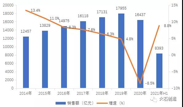 2021年由于新冠疫情影响有所好转,2021年上半年度药品销售总额比2020年同期有所增长,但较2019年同期低7.6个百分点。2021年上半年我国三大终端六大市场药品销售总额为8393亿元,同比增长8.8%。