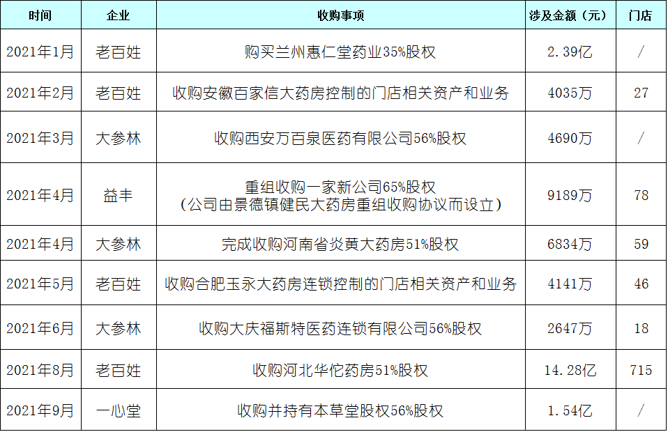 在刚刚过去的2021年里,头部连锁“大手笔”并购事件接连不断。据不完全统计: