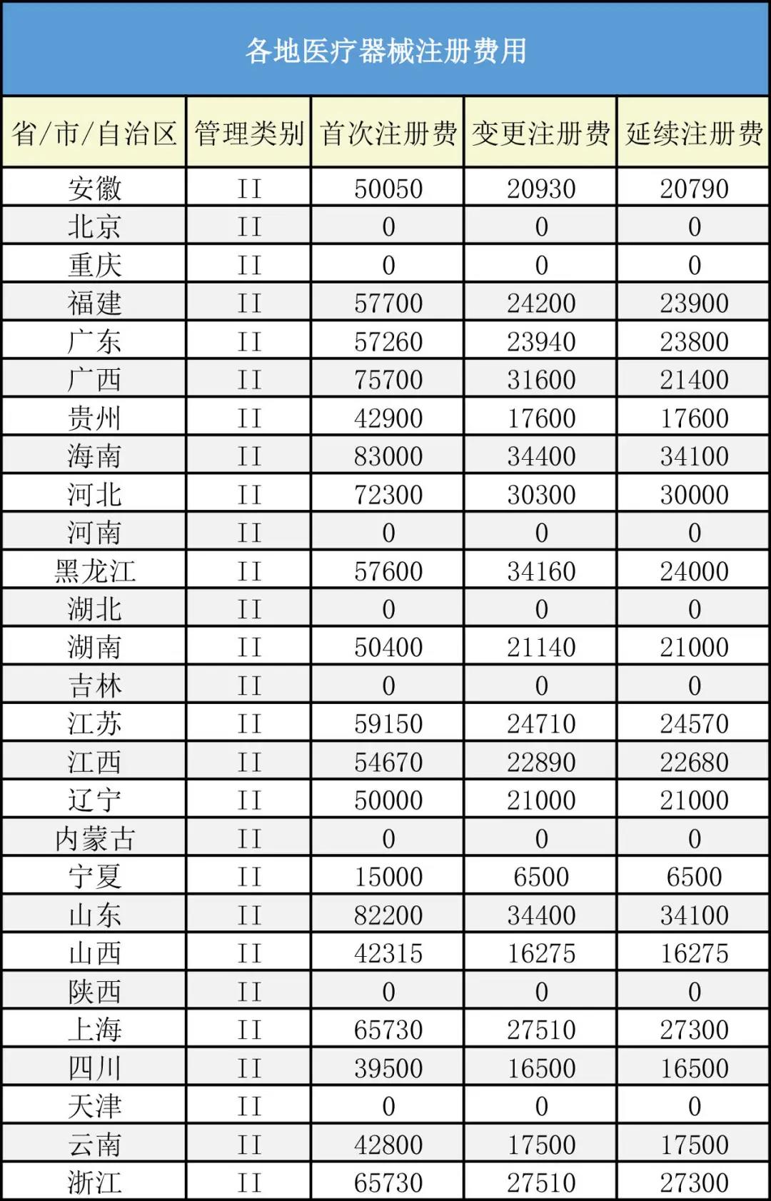 附:全国各省二类医疗器械注册费用一览表(截止2021年9月)