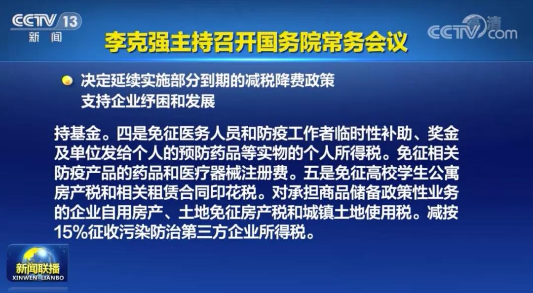 会议提出,为帮助企业纾困解难,促进创业创新,会议决定,在前期已对部分到期税费优惠政策延期的基础上,再延续执行涉及科技、就业创业、医疗、教育等另外11项税费优惠政策至2023年底。