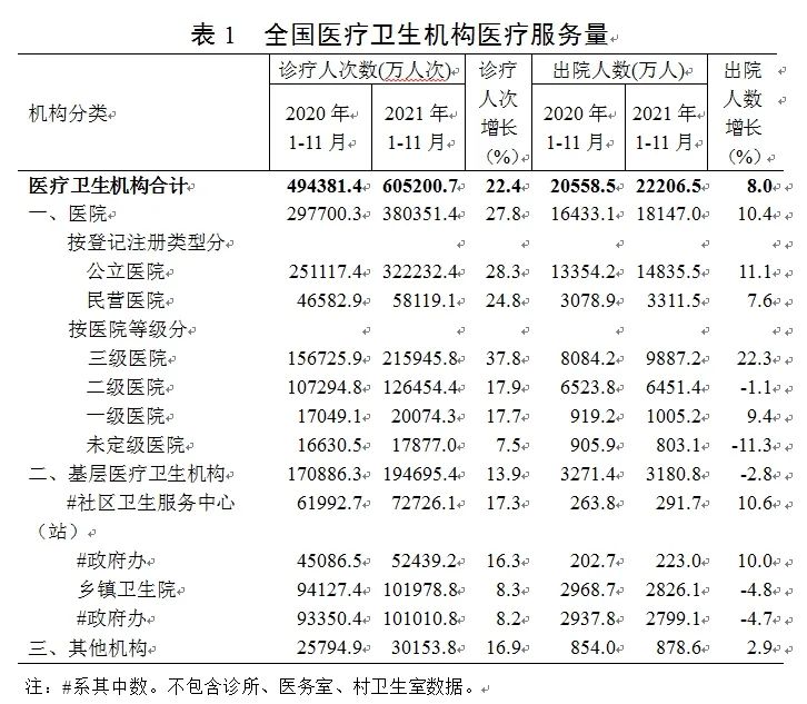 2021年1-11月,全国医疗卫生机构总诊疗人次为60.5亿人次(不包含诊所、医务室、村卫生室数据),同比增长22.4%。