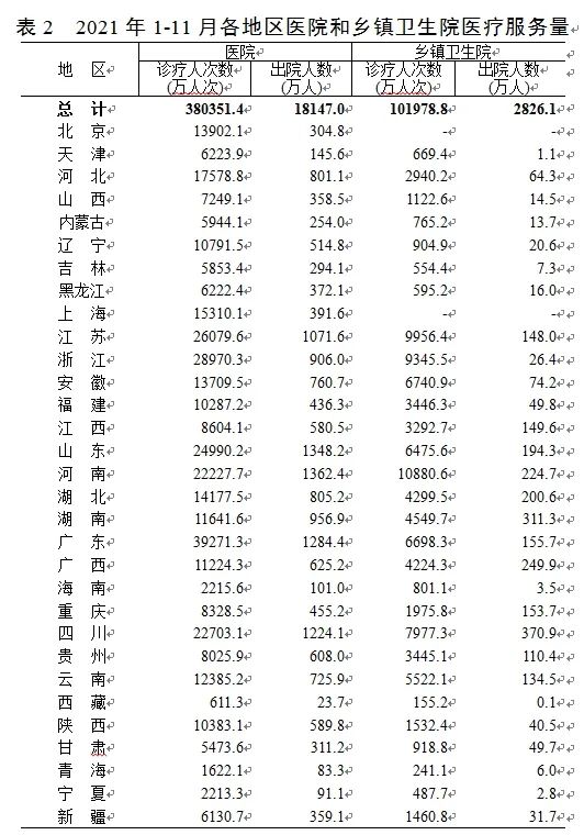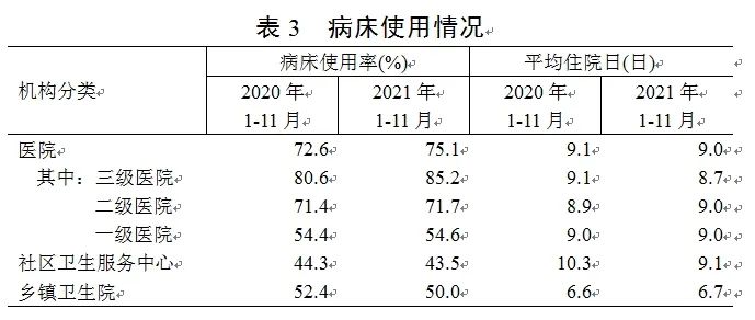 2021年1-11月,医院病床使用率为75.1%,同比提高2.5个百分点;社区卫生服务中心为43.5%,同比减少0.8个百分点;乡镇卫生院为50.0%,同比减少2.4个百分点。三级医院平均住院日为8.7日,比上年同期减少0.4日,二级医院平均住院日为9.0日,比上年同期增加0.1日。