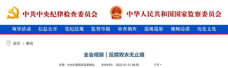 1月21日,中央纪委国家监委网站发布《全会观察 | 反腐败永无止境》一文,其中谈到,“腐败和反腐败较量还在激烈进行,并呈现出一些新的阶段性特征”。