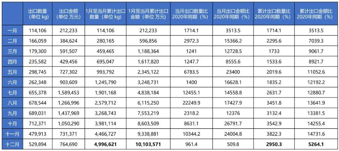 查阅相关数据和报道,2018年,2019年我国人用疫苗出口金额不足10亿元,因此,2021年全年人用疫苗出口金额和数量的大涨无疑与新冠疫苗的出口有关。