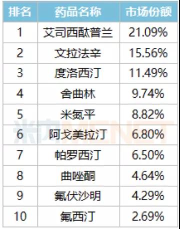 2021H1中国公立医疗机构终端抗抑郁药通用名TOP10