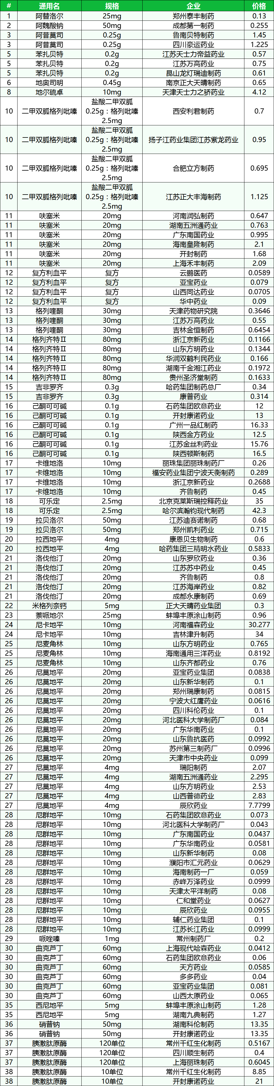 1月25日,豫晋蒙赣粤桂渝贵滇陕青宁新兵团十四省(区、市、兵团)药品联盟公布了38个品种的采购中选结果和中选企业供应清单,附中选结果简表如下(拟中选价格是最小规格单位:片、粒、支):