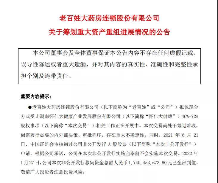 1月7日,老百姓大药房发布公告称,公司非公开发行募集资金总额人民币17.4亿元于1月27日已全部到位,并且拟以现金方式受让湖南怀仁大健康产业发展股份有限公司(以下简称“怀仁大健康”)46%-72% 股权,实现对怀仁大健康的控股。