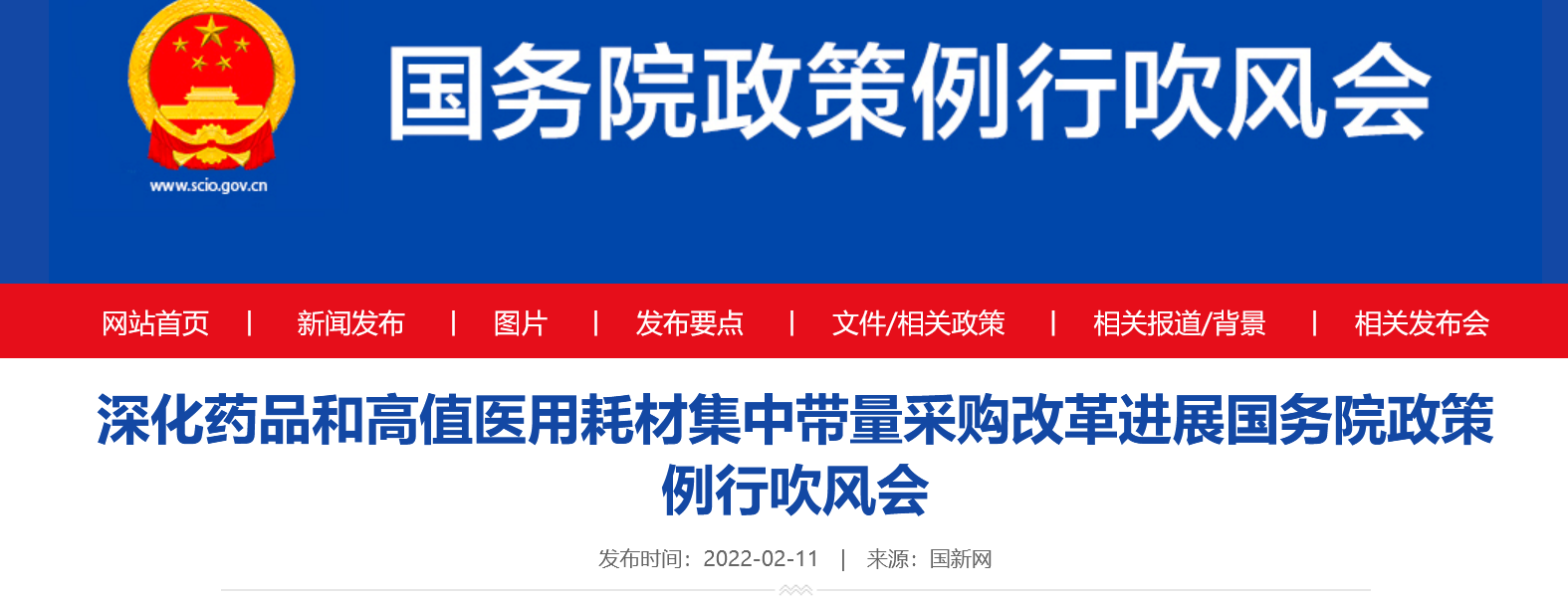 2月11日,国务院新闻办公室举行深化药品和高值医用耗材集中带量采购改革进展国务院政策例行吹风会,会议指出,未来将通过不断完善措施,特别是将供应、质量、信用等相关因素纳入集采规则,从体制机制上净化医药流通的生态环境,即根治带金销售,净化行业生态,从而激励企业通过规范竞争,促进流通行业的整治。