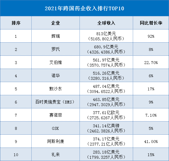 跨国药企top10,大品种优势明显