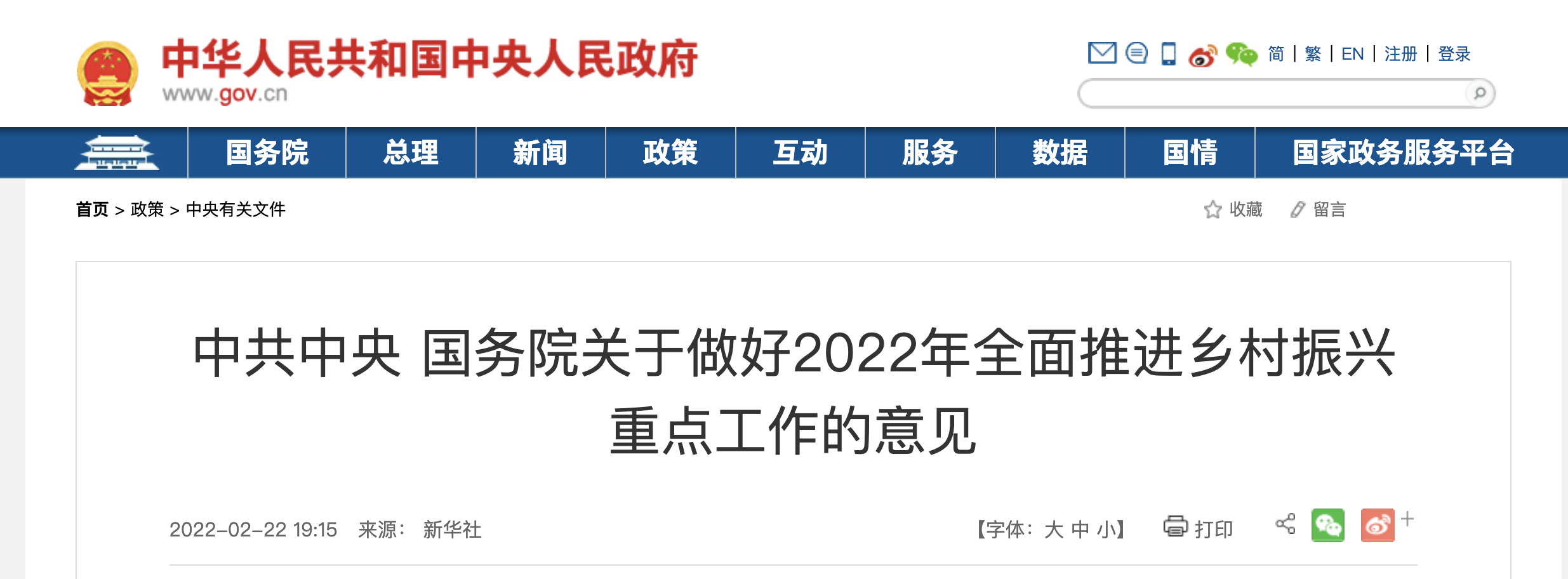 2月22日晚,《中共中央 国务院关于做好2022年全面推进乡村振兴重点工作的意见》发布,这是21世纪以来第19个指导“三农”工作的中央一号文件。