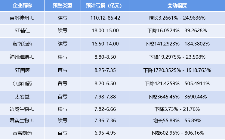 预告亏损前10名的医药企业