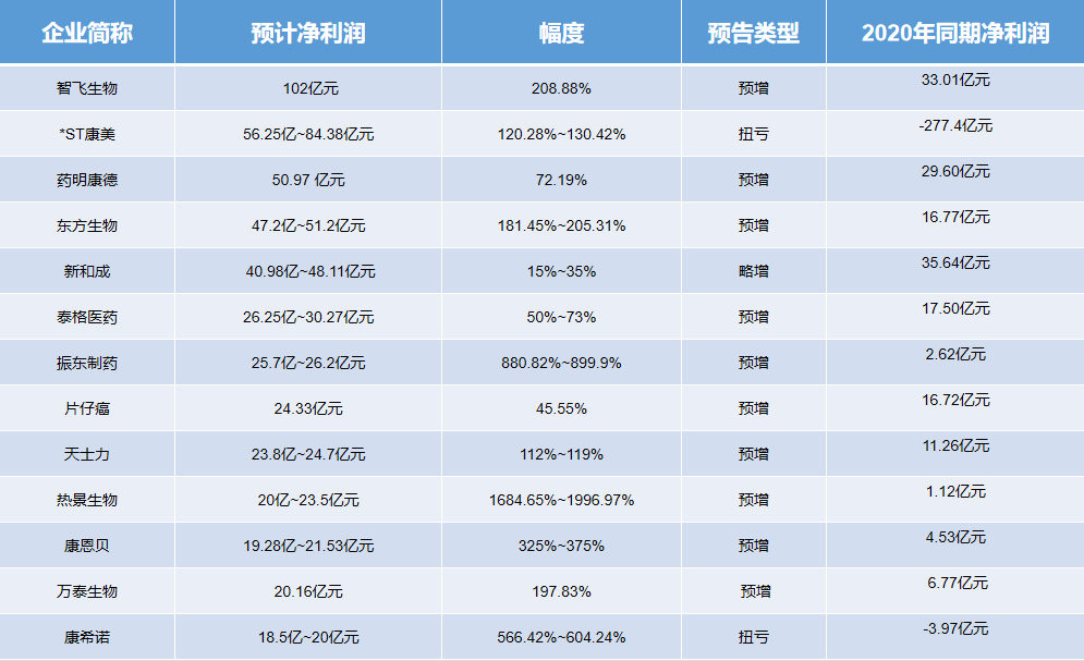 13家预告净利润超20亿元的医药企业