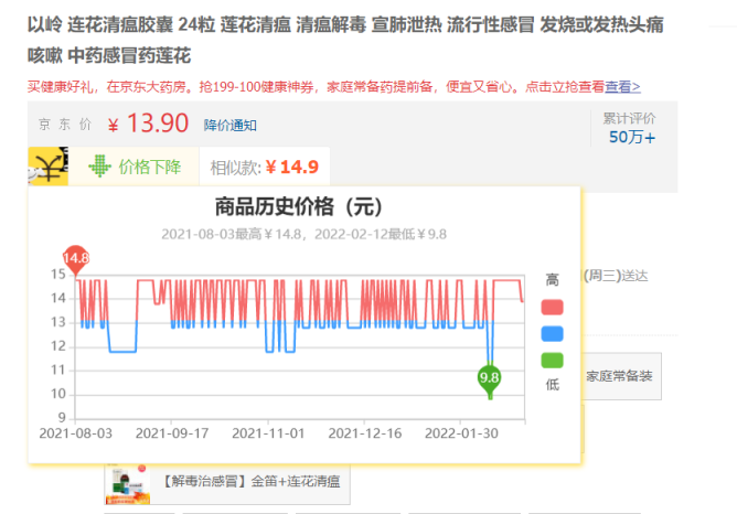 反观内地市场,连花清瘟胶囊价格波动范围一般不大。以连花清瘟胶囊(规格:0.35g*24)为例,某知名电商平台自营价格为13.9元,价格波动范围在12—15元区间。
