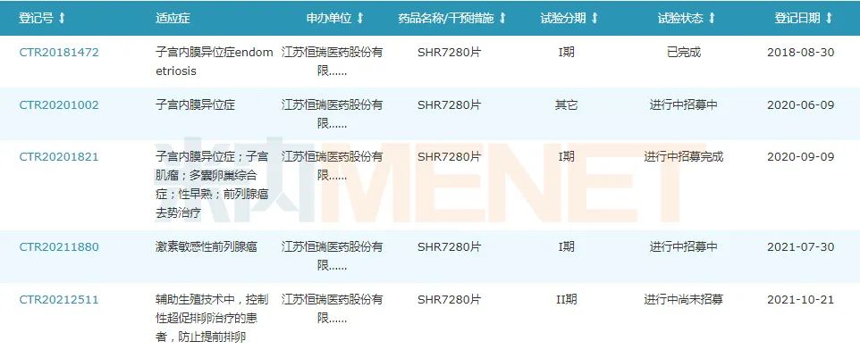 恒瑞的化药1类新药SHR7280片是一种口服小分子GnRH受体拮抗剂,最早在2017年5月提交新药临床申请,目前已有4个适应症获批临床,包括:拟用于雌激素依赖性疾病;用于前列腺癌的治疗;辅助生殖技术中,用于控制性超促排卵治疗的患者,防止提前排卵;子宫肌瘤。