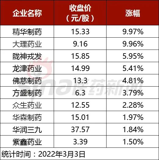 3月3日,中药股持续走高,大理药业直线拉升封板,精华制药、陇神戎发、佛慈制药、龙津药业、方盛制药等大幅升高。