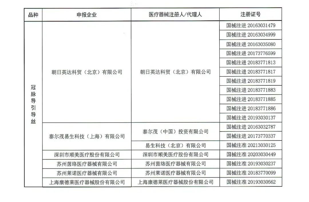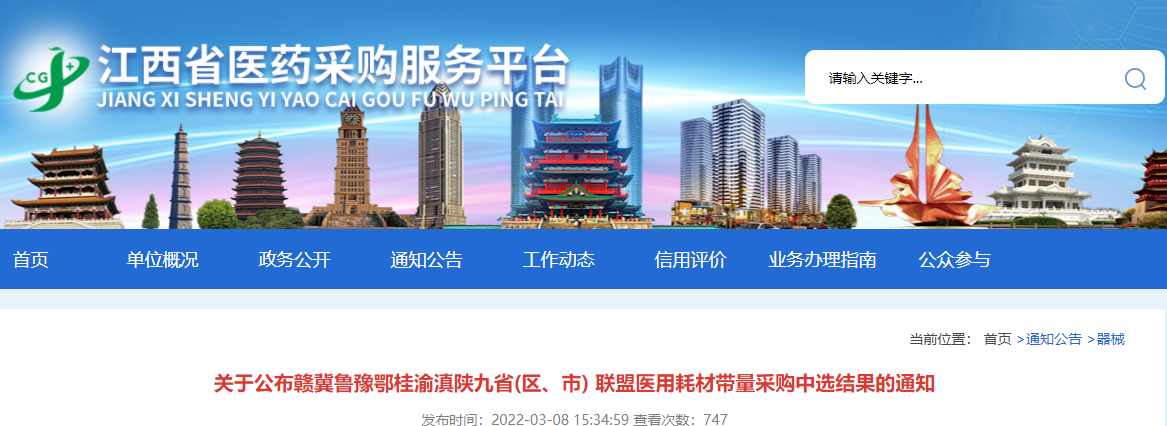 2022年3月8日,江西省药品医用耗材采购联盟联席会办公室发布《关于公布赣冀鲁豫鄂桂渝滇陕九省(区、市) 联盟医用耗材带量采购中选结果的通知》,来自美敦力、雅培、泰尔茂等多家企业的冠脉导引导管等医用耗材中选。