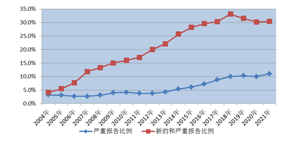 图2 2004年-2021年新的和严重以及严重药品不良反应/事件报告比例