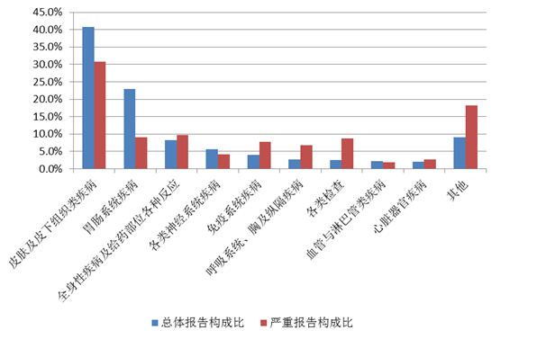 2021年抗感染药不良反应/事件报告中,总体报告和严重报告的药品不良反应/事件累及器官系统情况详见图9。与抗感染药的总体报告相比,严重报告的全身性疾病及给药部位各种反应,免疫系统疾病,呼吸系统、胸及纵隔疾病,各类检查构成比明显偏高。