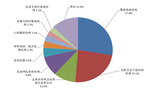 2021年报告的药品不良反应/事件中,累及器官系统排名前3位依次为胃肠系统疾病、皮肤及皮下组织类疾病、全身性疾病及给药部位各种反应。