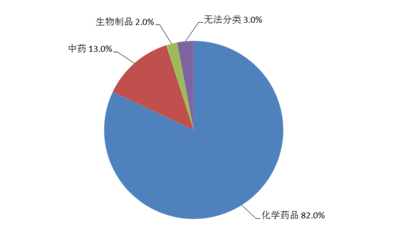 按照怀疑药品类别统计,化学药品占82.0%、中药占13.0%、生物制品占2.0%、无法分类者占3.0%(图6)。