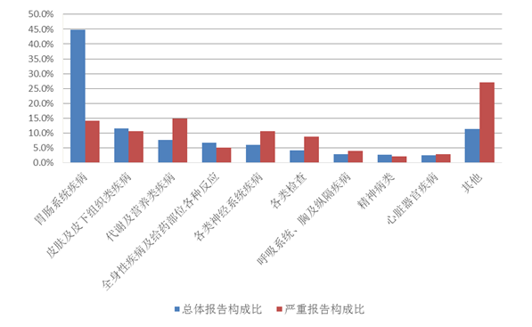 代谢及内分泌系统用药总体不良反应/事件报告中,口服制剂累及器官系统排名前5位的是胃肠系统疾病、皮肤及皮下组织类疾病、代谢及营养类疾病、各类神经系统疾病和全身性疾病及给药部位各种反应;注射剂累及器官系统排名前5位是胃肠系统疾病、皮肤及皮下组织类疾病、代谢及营养类疾病、全身性疾病及给药部位各种反应、各类神经系统疾病。