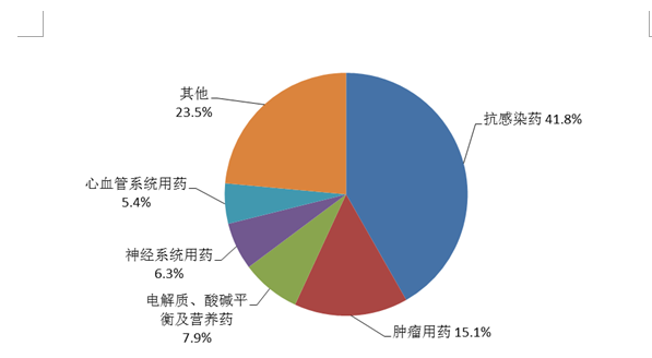化学药品注射剂报告数量排名前3位的药品类别是抗感染药,肿瘤用药,电解质、酸碱平衡及营养药(图12)。