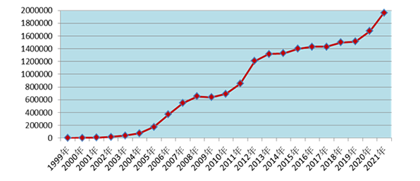 图1 1999年-2021年全国药品不良反应/事件报告数量增长趋势