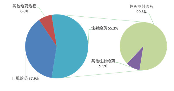按照给药途径统计,2021年药品不良反应/事件报告中,注射给药占55.3%、口服给药占37.9%、其他给药途径占6.8%。注射给药中,静脉注射给药占90.5%、其他注射给药占9.5%(图7)。