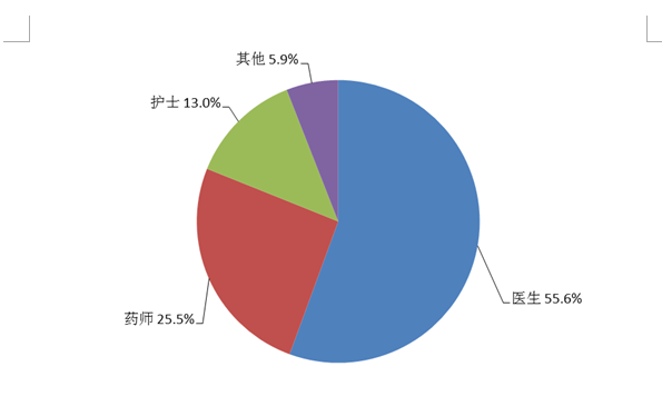 按照报告人职业统计,医生占55.6%,药师占25.5%,护士占13.0%,其他职业占5.9%(图4)。