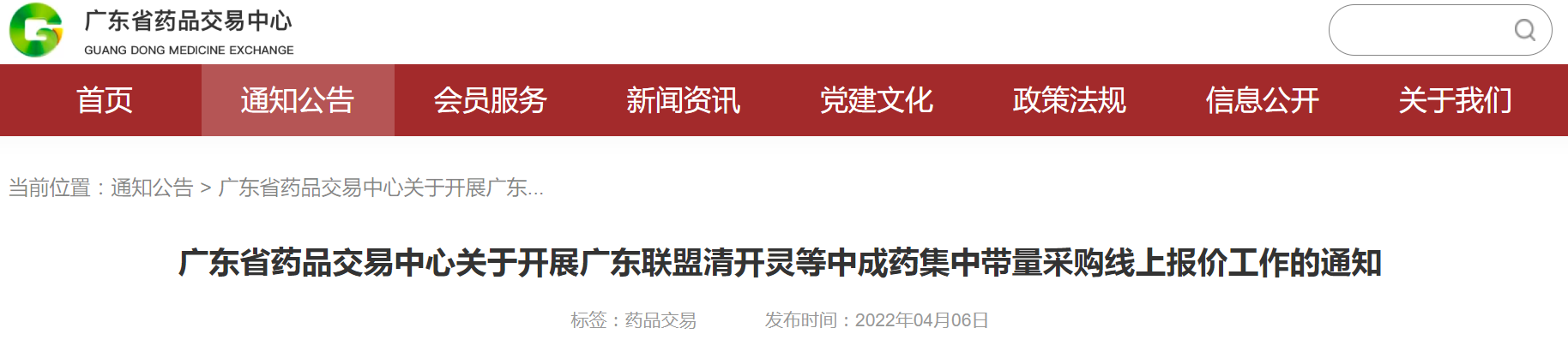 4月6日,广东省药品交易中心发布关于开展广东联盟清开灵等中成药集中带量采购线上报价工作的通知。