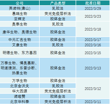 -先发优势:截至2022年3月30日,国内目前已获批20家新冠抗原检测试剂厂家,其中14款为胶体金法,分别是亚辉龙、万孚生物、康华生物、奥德生物、中元汇吉生物、明德生物、诺唯赞、热景生物、万泰生物、博奥赛斯、乐普诊断、重庆明道捷测、东方生物、东方基因;4款为乳胶法,英诺特、奥泰生物、北京金沃夫、艾康生物;3款为荧光免疫层析法,分别是深圳华大因源、北京华科泰.、易瑞生物。