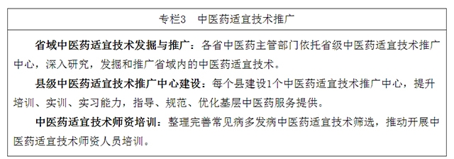 7.加强中医药适宜技术推广平台建设。完善省级中医医院中医药适宜技术推广中心设置,提升原县级常见病多发病中医药适宜技术推广基地能力,建成县域中医药适宜技术推广中心,省、县两级中心应具备符合规范要求的师资、设施、设备,设置有符合标准的适宜技术示教和实训场地,具备远程培训示教能力。全面完善适宜技术推广工作机制,各中心要落实适宜技术推广责任制,按要求配置适宜技术推广人员,负责县域、乡镇、村级卫生机构适宜技术推广,做到人员相对固定。到2025年,原则上所有县域均应设置符合标准的中医药适宜技术推广中心。